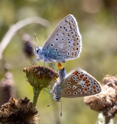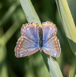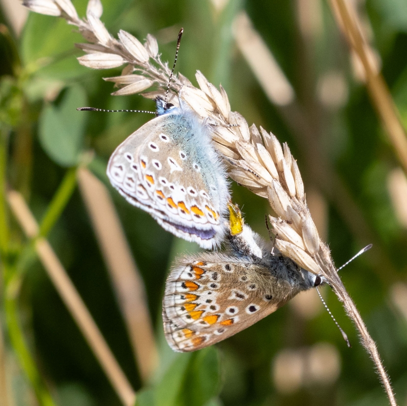 Browndown (South) Gosport. A decent survey of the MOD training area this afternoon (1320-1600, 22 deg C, sunny with southerly breeze) counted ten species. No immigrant butterflies to report but plenty of colour especially among the Common Blue community which is well into its second Summer generation with some quite stunning shades seen of the female Variety Fb. Mating pairs of Meadow Brown and Common Blue noted. Also of record was a complete absence now of Grayling that appear to have run their course for 2025.