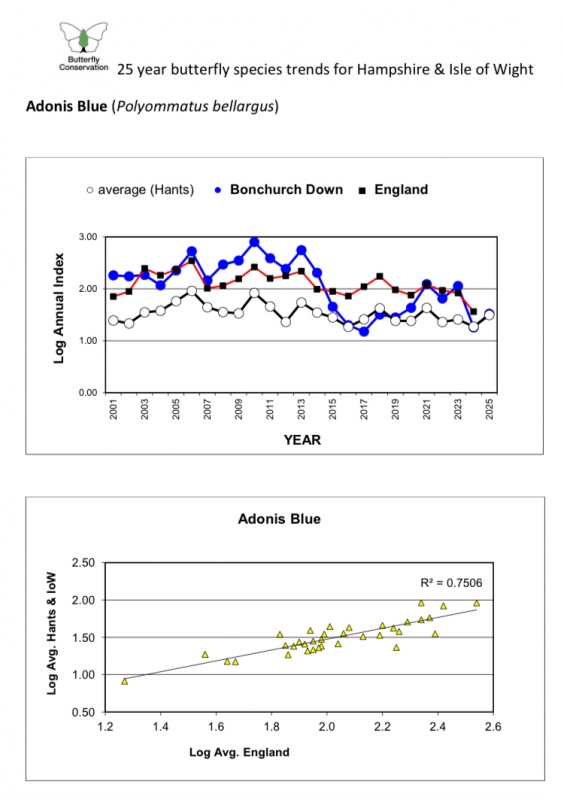 25-year butterfly transect trends. For those butterfly enthusiasts who are interested in the 25-year trends for all Hampshire & Isle of Wight butterfly species, I'm pleased to say that the latest plots (2001-2025) are now available to view on the Butterfly Conservation (Hampshire & Isle of Wight) website. By reading this news you're already accessing the website. To find the 25-year trends simply click on the "Transects" tab, then select "25 year trends". I've attached a selection of three screenshots below so that you can see what the plots look like. There's a page like this for each species. [Posted by Andy Barker]