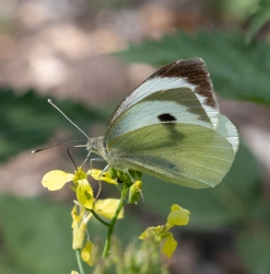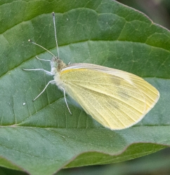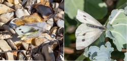 Meon Shore, Cliffs, Solent Breezes & Chilling Coastal Area. Thirteen species were recorded on a walk from 1110-1440 (22 deg C with SE breeze). Common Blue and the brassicae excepted, numbers recorded were low. Target specie was Clouded Yellow and one of each sex was seen on the cliffs just west of the Brownwich stream as it enters the sea and in and around the winter greens/wild flowers' field. Here too most of the Small and Large White butterflies were prominent. Finding the much anticipated Southern Small White will provide some excitement/disappointments as illustrated by the two examples of female Small White shown below. The right-hand butterfly showing the more typical faint black/grey markings and the other (a really diminutive butterfly found on the Brownwich shore) that evidences stronger coloration with slightly squared wing spots; but this is not Southern Small White - although it had me studying it hard! Total: Common Blue (M)(11)(F)(4) (incl mating pair); Small White (159); Small Heath (1); Large White (45)(incl mating pair); Speckled Wood (3); Red Admiral (2); Comma (2); Clouded Yellow (F)(1)(M)(1); Brown Argus (3); Meadow Brown (1); Peacock (4); Small Copper (1); Holly Blue (2). [Posted by Francis Plowman]