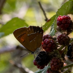 Alver Valley Country Park. Gosport. My first walk around this wide and diverse-habitat area for a few years realised 15 species including further sightings of Brown Hairstreak. Having seen my first of the year recently nearer Browndown North and my friend David yesterday having found more along the main tarmac road that generally bisects the area, I opted to complete a full perambulation. From 1100-1500 (with 30 minute lunch at the ideally placed cafe) the temperature rose from 25-29 deg C making it a warm wander for sure. (The going is mostly on the flat with strategically placed benches along the main pathways). The morning sightings of Brown Hairstreak were high mostly in-flight but the photograph was obtained when finding the butterfly feasting on blackberries tucked away in a fence-line hedge during the afternoon. First Peacock sighting for August was also very welcome. Nature has largely been left to its own devices at this site and an earlier visit for Brown Hairstreak next year may well prove rewarding. Total: Large White (11); Red Admiral (4); Small White (30); Green-veined White (2); Comma (3); Speckled Wood (18); Brown Hairstreak (6); Meadow Brown (39); Small Heath (12); Small Copper (2); Holly Blue (2); Gatekeeper (2); Peacock (1); Brown Argus (1); Common Blue (M)(2). [Posted by Francis Plowman]