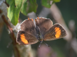 Brown Hairstreak on Stockbridge Down. A late morning/early afternoon stroll round Stockbridge Down proved unproductive for migrant birds (with the exception of a single Redstart) but very productive for butterflies, with many fresh Small Coppers along with several Small Heath, Common Blue, Chalk Hill Blue and Meadow Brown, but the star of the show was a female Brown Hairstreak basking low down in the scrub midway between the hillfort and the small car park. [Posted by Kevin Haggar]