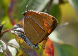 Purple butterflies at West Wood. A trip to West Wood to check on the Purple Emperor caterpillars turned up a very late Purple Hairstreak. One caterpillar was missing in action but a new one was found on a leaf with absolutely no feeding damage. The others exhibited classic feeding patterns. [Posted by Mark Tutton]