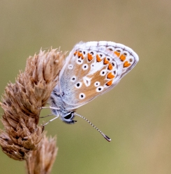 Seafield Park & Promenade Field, Hill Head. A late afternoon circulation of Seafield Park and the adjacent shore-side promenade field realised sighting of just eight species. (19.5 deg C, overcast and NW breeze). Mostly noted were butterflies that were roosting for the night allowing closer observation and (hopefully) steadier photography! That said, two mating pair couples (Meadow Brown) were most uncooperative and disappeared on the NW breeze. No sighting of Clouded Yellow but the promenade field is slowly producing more flora; it just needs a good drop of rain! Total: Small Heath (9); Common Blue (M)(3)(F)(4); Brown Argus (1); Meadow Brown (19); Small White (F)(4); Red Admiral (1); Large White (1); Small Copper (1). [Posted by Francis Plowman]