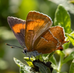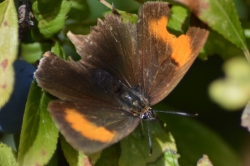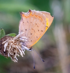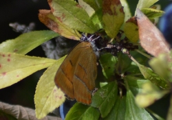 Seafield Park & Promenade Field, Hill Head. Some really bright and fresh butterflies attended my walk (1130-1345, 19.5 deg C, sunny periods, SW breeze) totalling 11 species. Previously I had never recorded Brown Hairstreak here but today three were seen. There are well established hedgerows around the park and one Brown Hairstreak was seen feeding on blackberries, another in flight along the hedgerow (very heavy with Sloe berries) whilst the female (shown) was photographed on a small plant about a foot from the ground. There was no sign of Clouded Yellow in either the park or the field adjacent to the promenade the latter area now with much yellow flora. Total: Large White (7); Small Copper (15); Meadow Brown (10); Common Blue (M)(14)(F)(3); Small White (14); Brown Hairstreak (3)(incl 2 female); Speckled Wood (1); Red Admiral (3); Brown Argus (2); Small Heath (2); Peacock (1). [Posted by Francis Plowman]