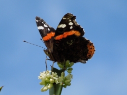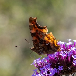 Vanessid flush at Great Fontley. Four different vanessids seen during the midday sunshine at Great Fontley: Painted Lady, Peacock, Comma and Red Admiral, just one of each, nectaring on the inextinguishable Verbena bonariensis and Buddleja 'Autumn Beauty'. All were in pristine condition, the Peacock possibly second brood?