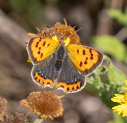 Monks Walk, Frater Fields & Woods, Gosport. A slow wander 1330-1600 under cloudy skies with strong SW breeze (21.5 deg C) with some heavy thunder rolling around, allowed eleven species to be recorded. A surprising number of Common Blue (all males) were particularly apparent in the enclosed 'navy' field where fleabane and ragwort remain in bloom. (The recent rains should help prolong the flora here well into September, well, I hope so!) Here too I recorded the Small Copper variety caeruleo-punctata (or blue-spotted) among the seven noted. (Also into this field strolled a very large deer with impressive antlers but it turned-tail on sighting me; the resulting photograph managing only to obtain a hind leg.....and some you lose!) Total: Small White (16); Common Blue (M)(17); Small Copper (7); Brown Argus (1); Green-veined White (7); Large White (6); Meadow Brown (1); Holly Blue (2); Comma (6); Red Admiral (3); Speckled Wood (5). [Posted by Francis Plowman]