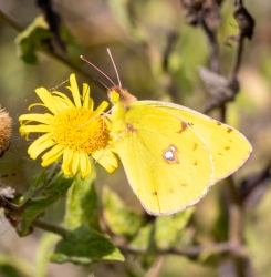 Haslar Sea Wall Car Park Scrub - Gosport. An afterthought visit to check-out this site for Clouded Yellow was fortunate as the sought after butterfly was the first seen quartering the field (1615-1645, 20 deg C, strong SW beeze). The male eventually settled although it soon flew off presumably in search of a female. The field is now almost devoid of flora but within the grasses the blues were found hunkering down from the strong wind. Total: Clouded Yellow (M)(1); Meadow Brown (1); Common Blue (M)(3)(F)(1); Small Heath (1). [Posted by Francis Plowman]