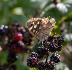 Monks Walk, Frater Fields & Woods, Gosport. A combined blackberry picking and butterfly wander realised 7lbs of the former and twelve species of the latter! From 1345-1550 with a humid 25 deg C there has clearly been a large emergence of Speckled Wood since my last record here (21 July, 13 species) for some very fresh insects were seen among the 19 counted. Most unusually, the females outnumbered the males and were resplendent in their clearly brighter and broader spots. (Also, by way of comparison, the female's abdomen is noticeably larger than that of the male). My first Small Heath of the year at this site was recorded in the flower strewn 'navy field' literally covered in fleabane, ragwort, St Johns wort, thistles and many grasses. This brings my sighting record at this site to 26 this year. I have yet to record Small Tortoiseshell here which is a disappointment. Total: Red Admiral (6); Comma (5); Speckled Wood (F)(10)(M)(9); Gatekeeper (15); Holly Blue (3); Large White (7); Common Blue (M)(8)(F)(1); Meadow Brown (7); Small Copper (1); Small Heath (1); Small White (7); Brown Argus (1). [Posted by Francis Plowman]