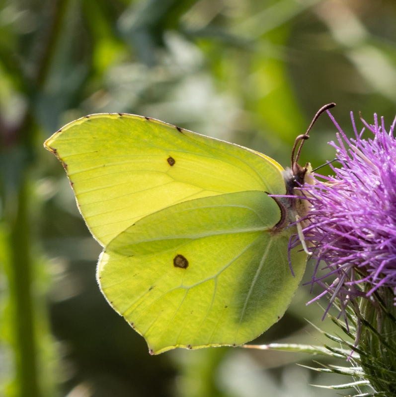 Portsdown Hill, Paulsgrove. Leaving Fort Widley behind we crossed the road and walked the top of Portsdown Hill westwards to a point opposite the military establishment. Reaching the roundabout section the top path was completely overgrown and inaccessible without a machete! So it was into the top of the hill following the chalk trails. This took from noon to 2.30pm with the temperature rising to 23.5 deg C and mostly blessed by warm sunshine and gentle SW breeze. The aim was to find Chalk Hill Blue and in that we were successful but with very limited numbers. The fields are awash with flora including many orchids still and it was a sheer pleasure to experience it. A fresh male Brimstone landed nearby on a daisy; as I approached I could see a spider about to strike and instinctively picked up the butterfly and placed it on my hand where it was very content to remain! After a photograph I returned it to some wild Marjoram where it remained for a while before flying off. I don't like spiders!